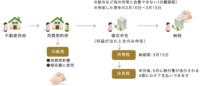 不動産の売却でかかる税金は、印紙税、所得税、住民税の3つです。以下に支払い時期を示します。